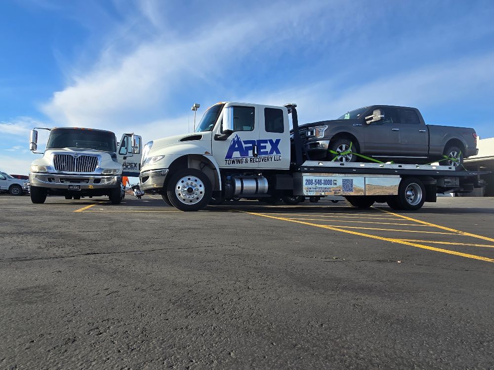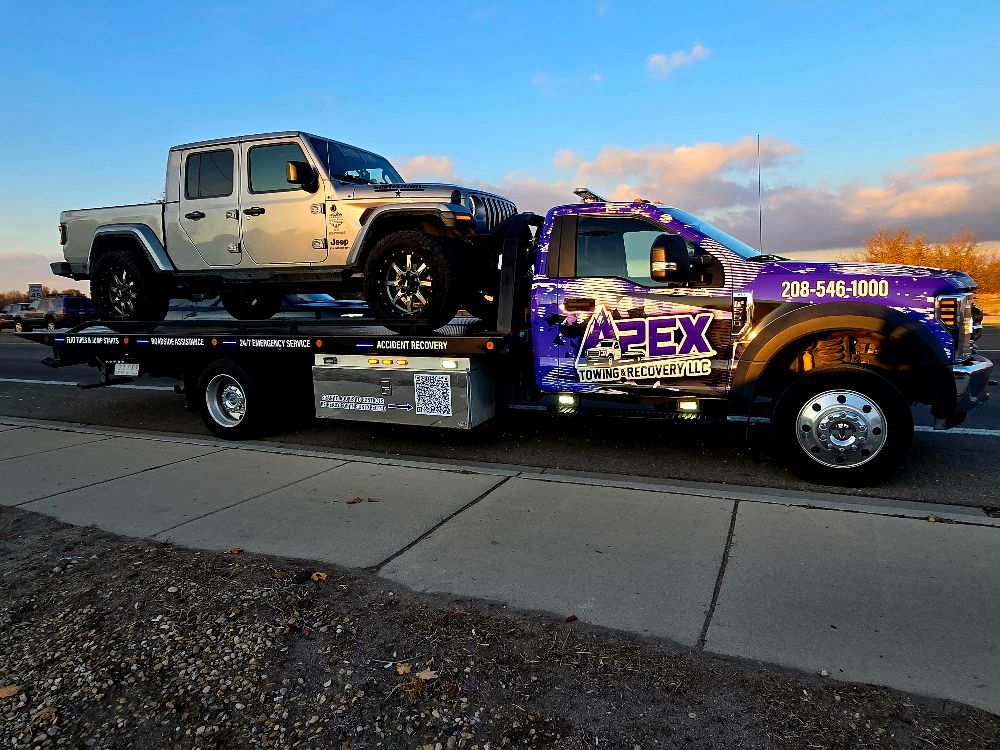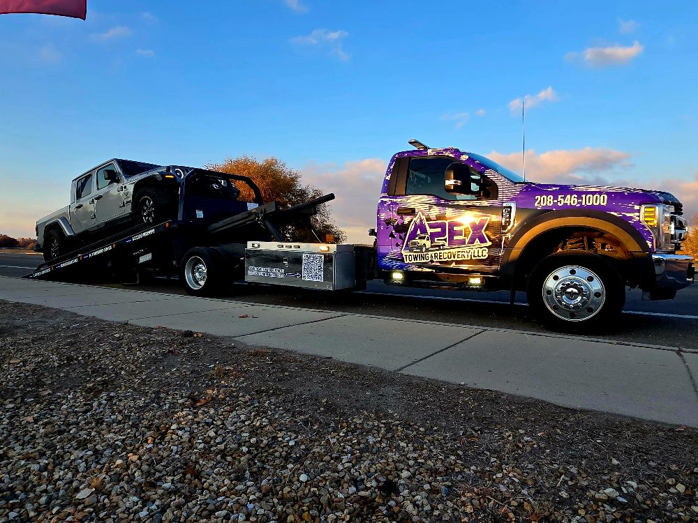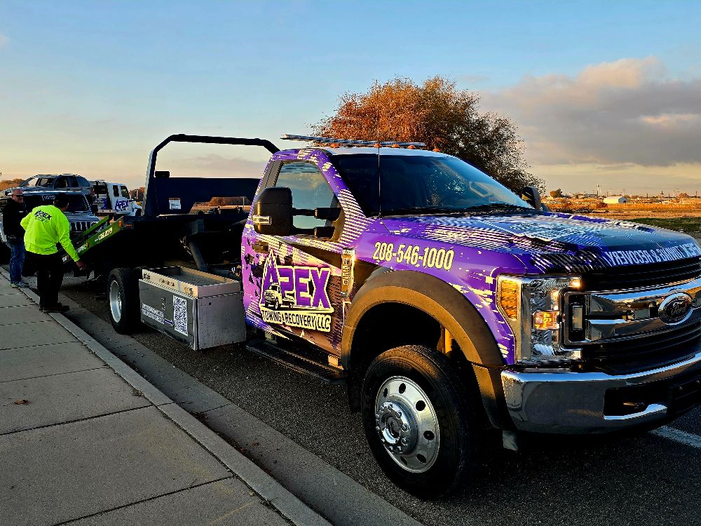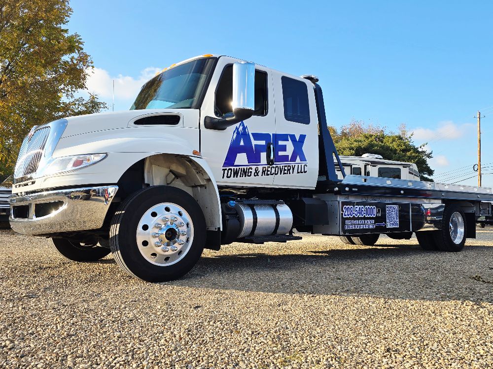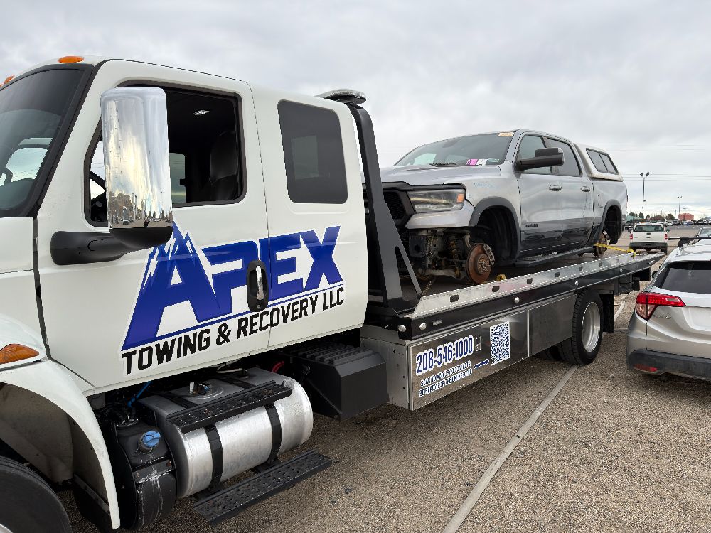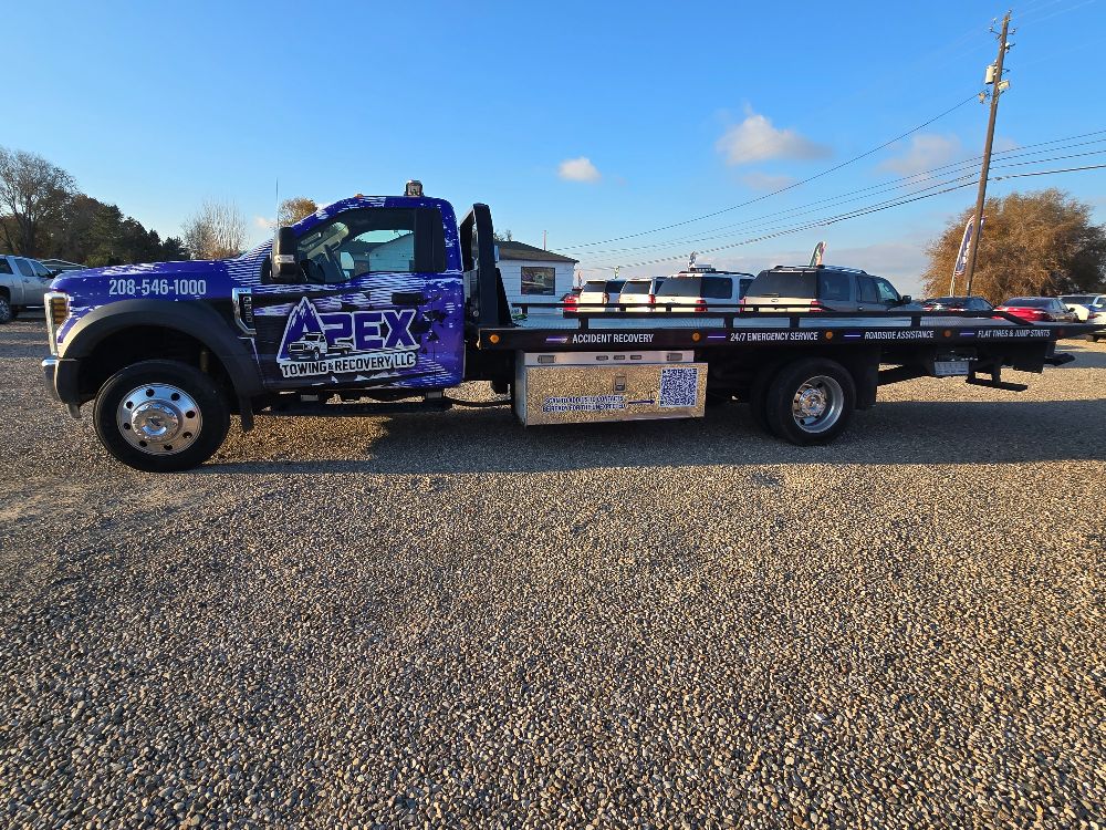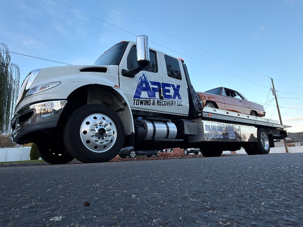 Apex Towing & Recovery LLC is proud to serve the Treasure Valley with professional towing and recovery services backed by modern equipment. Our gallery highlights the flatbed towing trucks, winch out operations, accident recoveries, and roadside assistance work we perform across Nampa, Caldwell, Boise, and surrounding communities.