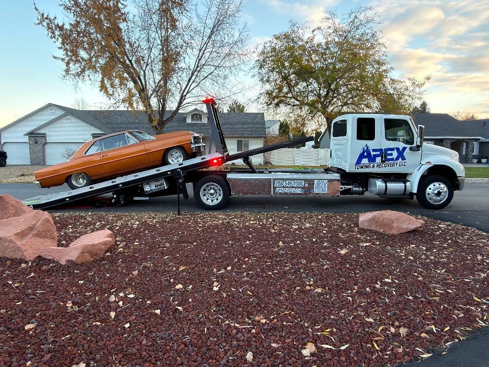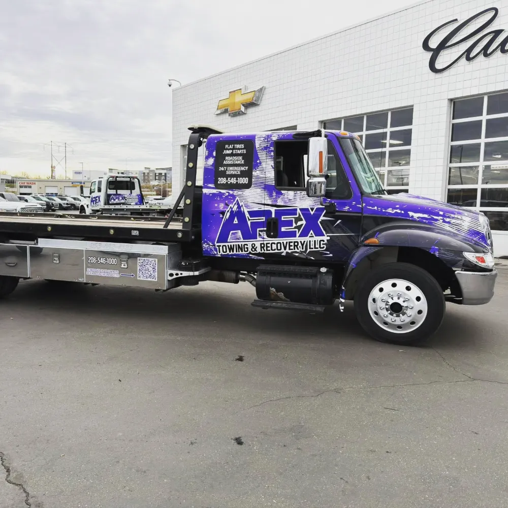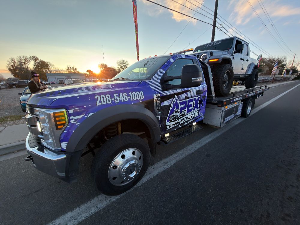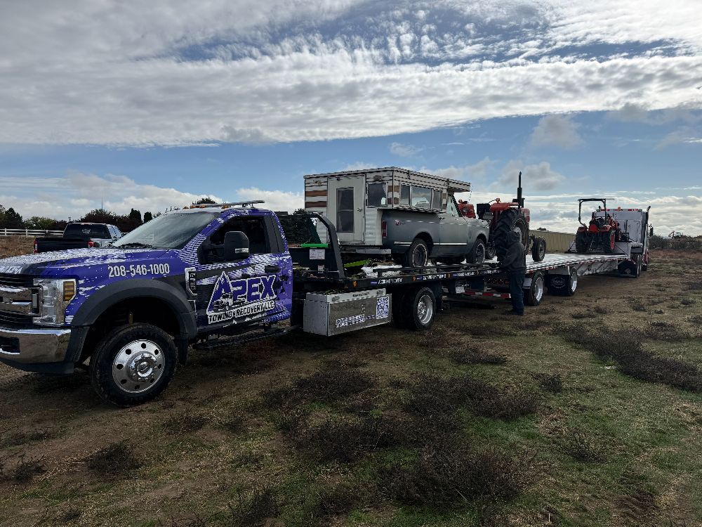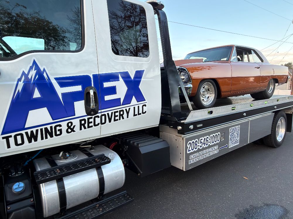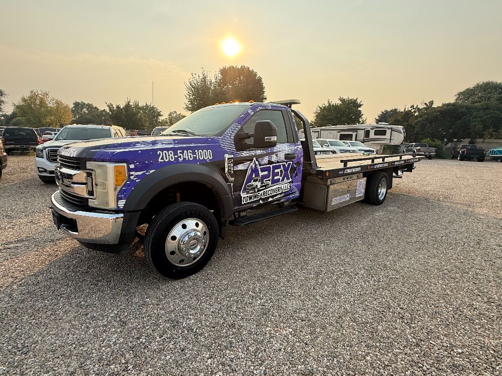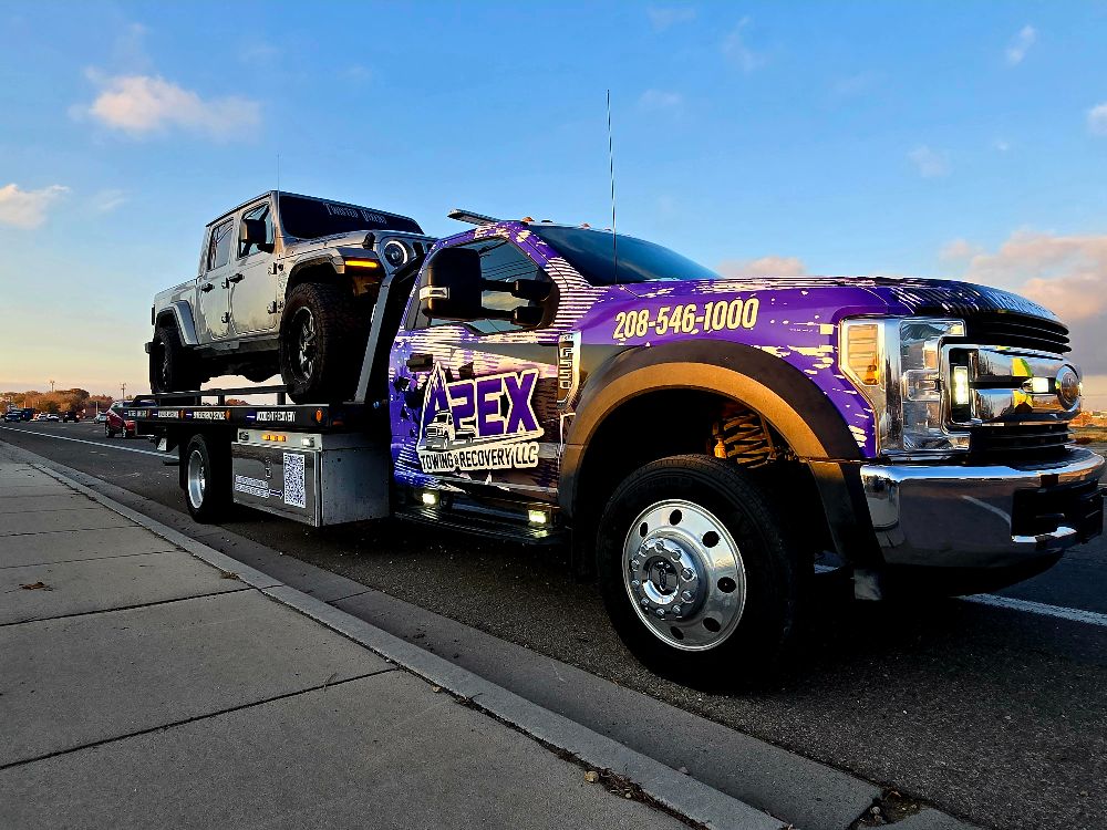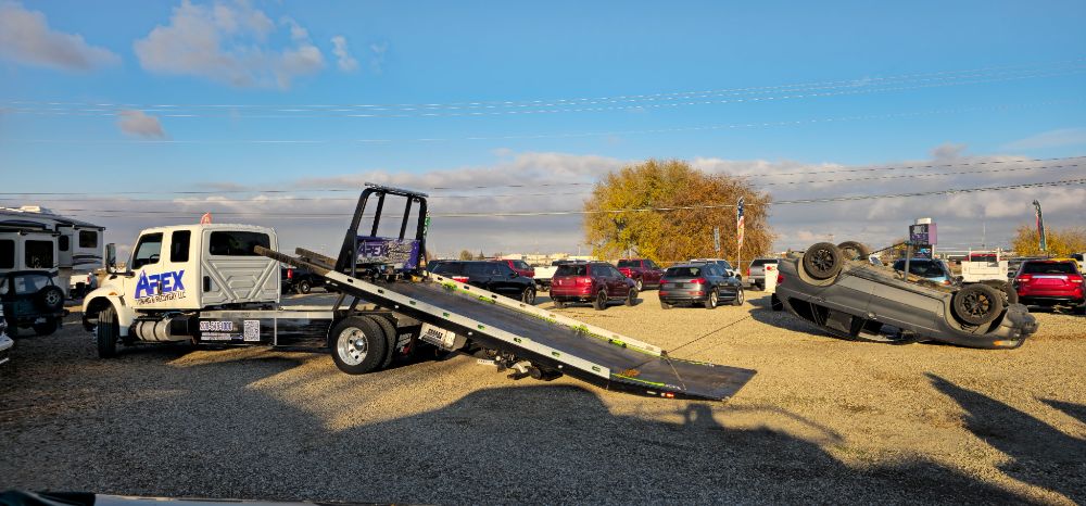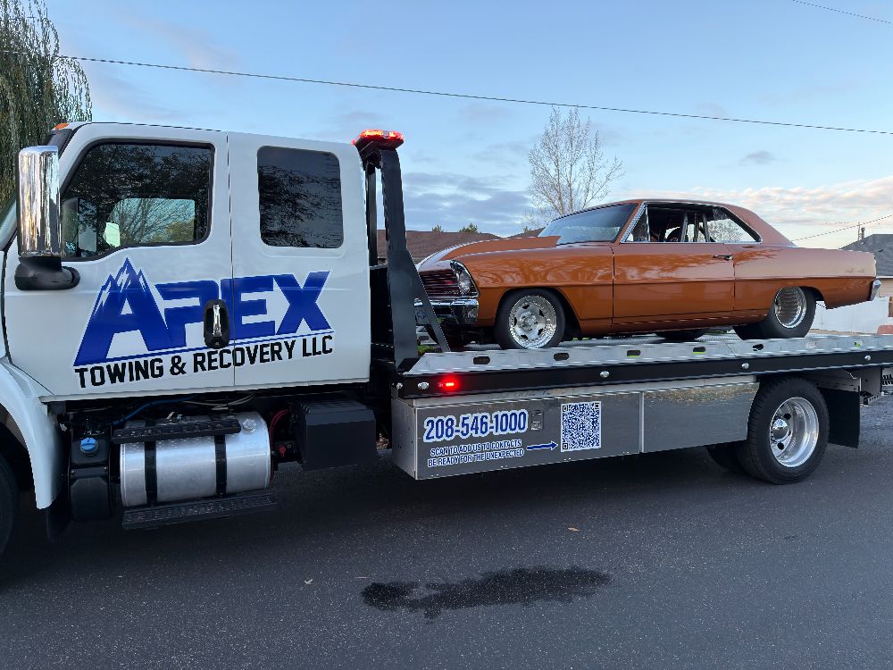 Apex Towing & Recovery LLC is proud to serve the Treasure Valley with professional towing and recovery services backed by modern equipment. Our gallery highlights the flatbed towing trucks, winch out operations, accident recoveries, and roadside assistance work we perform across Nampa, Caldwell, Boise, and surrounding communities.